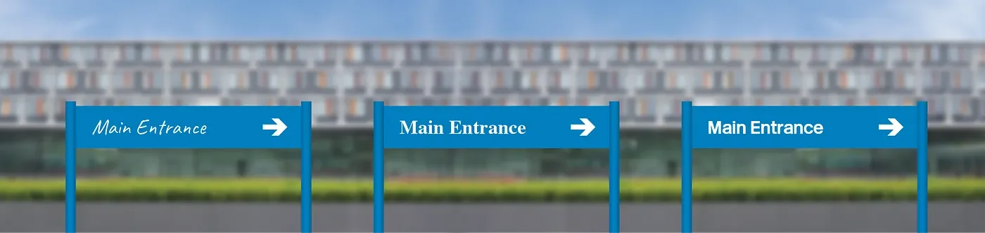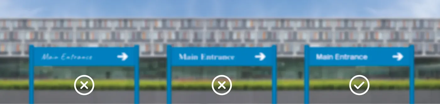 Image 1: In this image with three hospital navigation signs, the left one uses a handwritten typeface, the middle one uses a serif typeface, and the right one uses a sans-serif typeface.