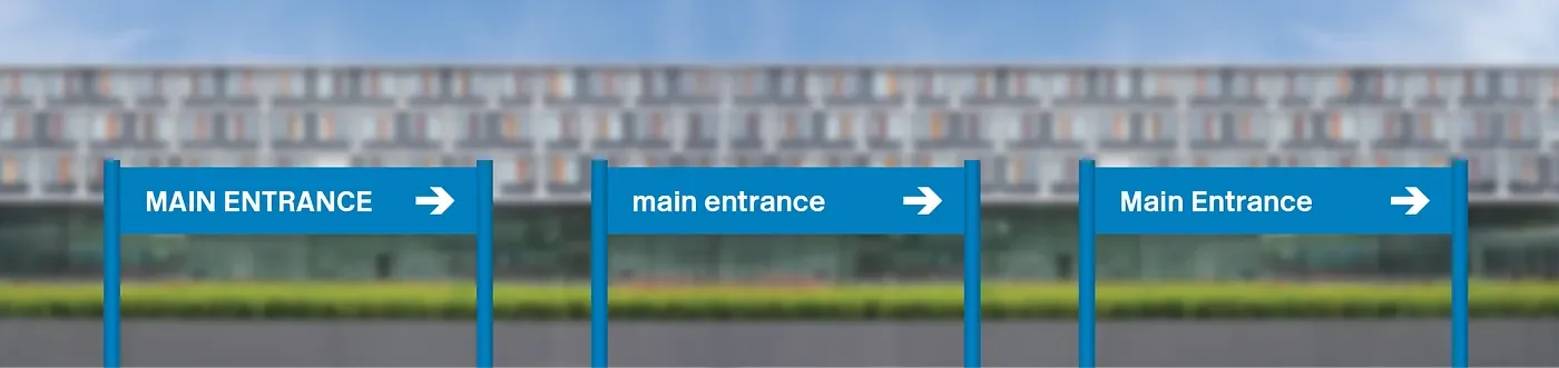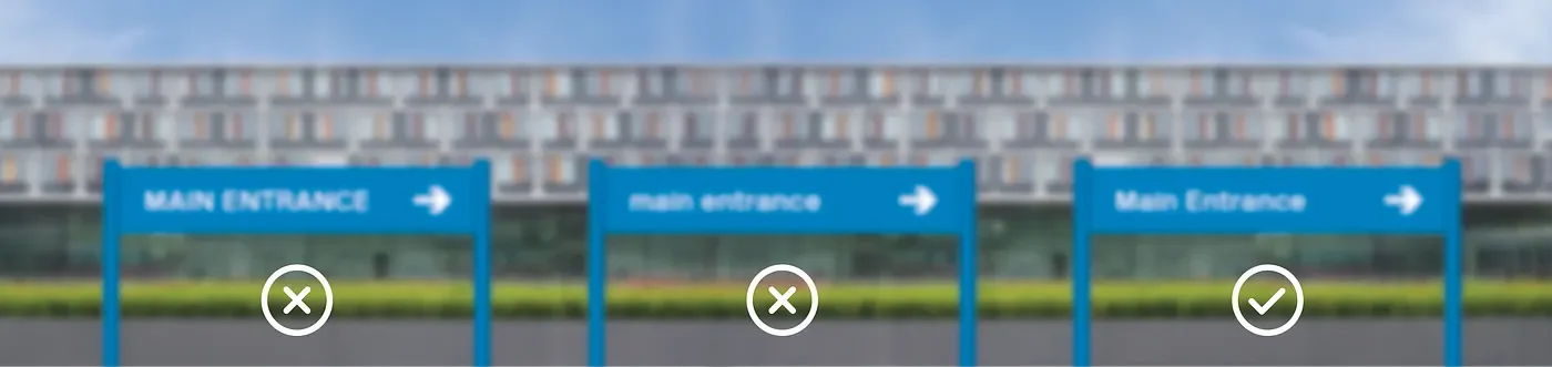 Image 2: The left sign is upper-case, the middle is lower-case, and the right is title case.