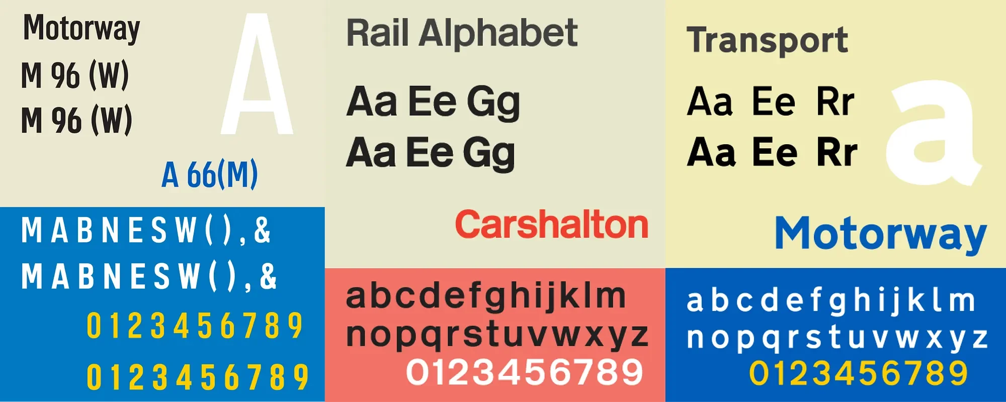 Left: Motorway Font (Source: Wikimedia Commons). Middle: Rail Alphabet (Source: Wikimedia Commons). Right: Transport Font (Source: Wikimedia Commons).