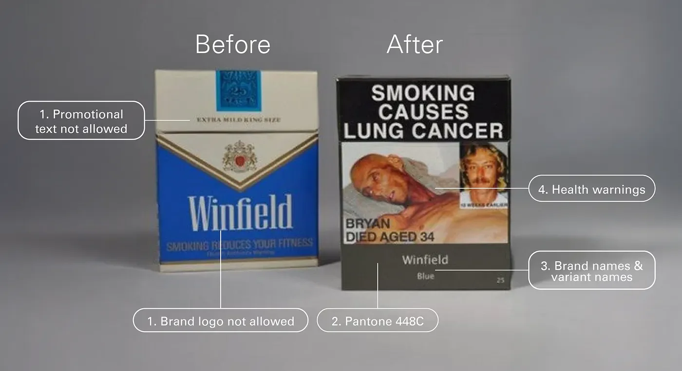 Australia became the first country in the world to fully implement plain packaging laws for cigarettes. Soon after, glossy logos, bright colours, and sleek typography were replaced with minimal colour, large graphic health warnings, and tightly regulated typography.